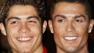 O atacante português Cristiano Ronaldo é um dos casos mais conhecidos de transformação estética no futebol. No início da carreira, apresentava desalinhamento dental e irregularidades perceptíveis.